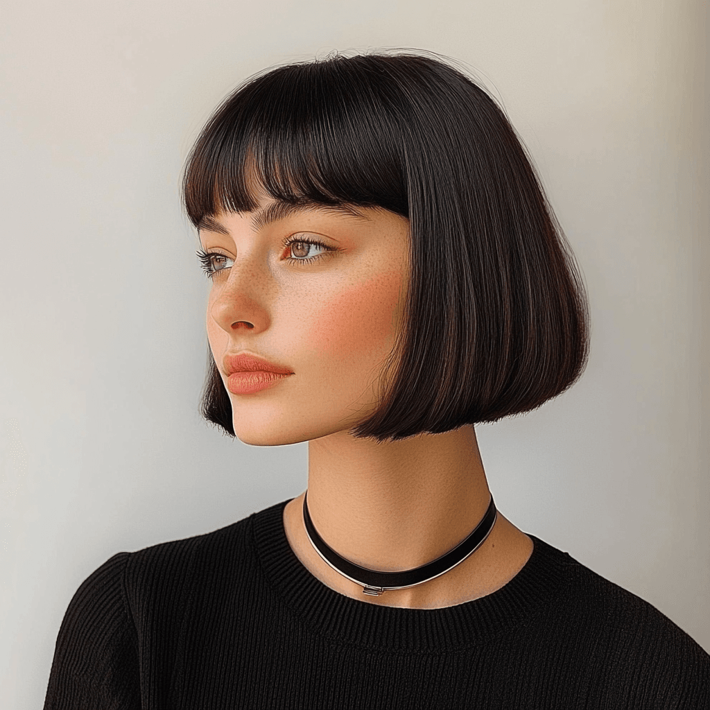 Description: A bob cut featuring textured ends paired with thick, straight-across bangs, creating a bold and sophisticated look.